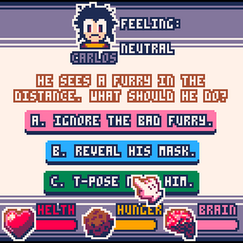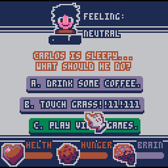 Carlos Simulator is an unofficial sequel to Carlos's Journey 2Bee Stupid, which a link I am not able to find to. It was made by me, D3V?, using Pico-8 in about a week. Don't get offended, you have been warned.